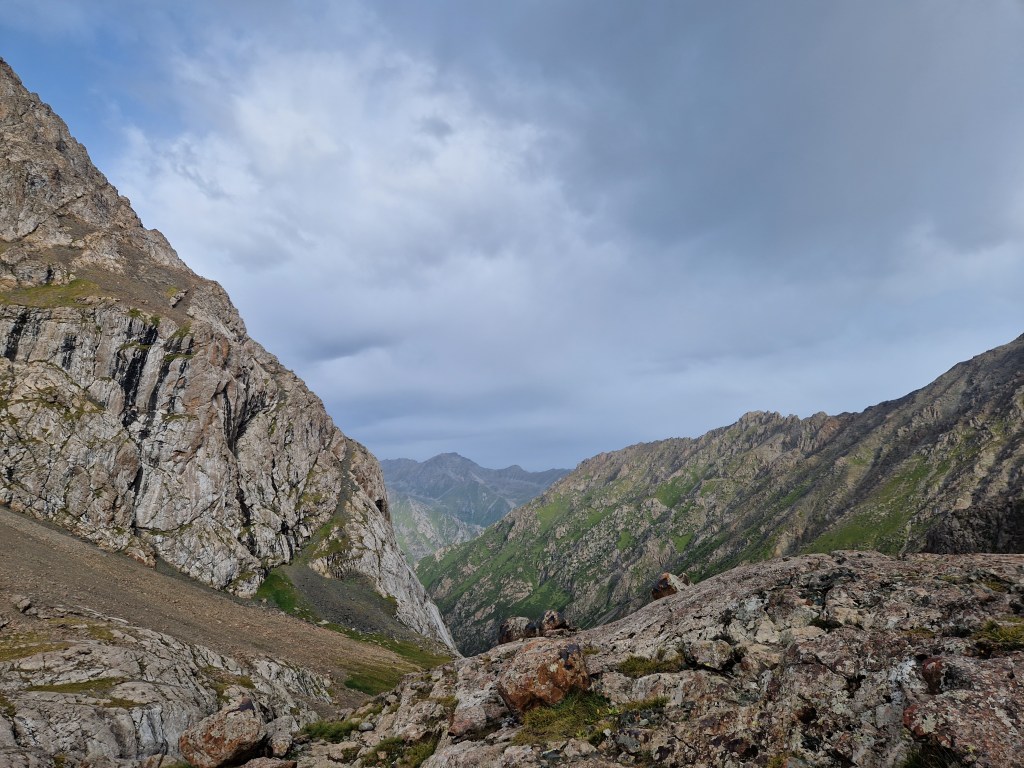 Ala Kul Lake was as far as I was going to go. Even this was possibly too high with the weather closing in and a dangerously steep scree slope to descend without any form of hiking poles or other support or stabilisation. With the complete lack of vegetation around me, the possibility of picking up a stick was also nil.